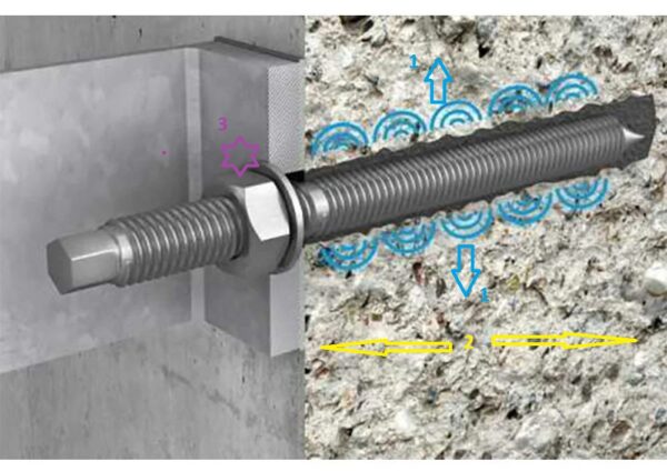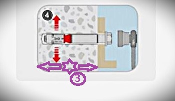 Prin strangerea cu cheia, gujonul incepe sa iasa din gaura iar placuta din capatul gujonului luneca pe con, presandu-se de peretii gaurii. Rezulta doua forte in gujon. Forta 4 care blocheaza varful conic de perete si forta 3 care intinde axial gujonul. Forta 4 are o contrareactie de echilibrare din partea peretelui iar forta 3 apasa pe perete comprimandu-l. Pentru o fixare ferma a piesei auxiliare (urechea) de perete, cat si pentru expandarea maxima a conului, exista tendindinta de a strange cat mai puternic piulita. Astfel fortele 3 si 4 au valori foarte mari si, mai ales, PASTRATE MEREU TOT TIMPUL ! Asta are doua efecte (IN TIMP):