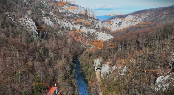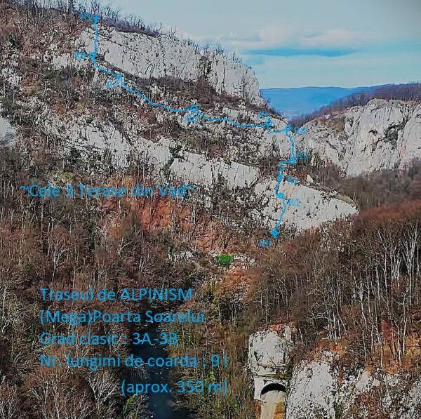 Personal l-am facut in 77 dus de niste prieteni (in timp ce asteptam sa apara micii la cabana) si de atunci am cam uitat de el. Intre timp in Terasa 3 au aparut multe trasee de escalada noi (iar linia de odinioara a cam ramas fara pitoane…nu ca ar fi singular cazul -din pacate-)… Asa ca in noile conditii, nedorind sa „deranjam” noul val „revolutionarist-alpin”, ne-am strecurat pe unde am putut si, pana la urma tot raul spre bine : A rezultat un traseu foarte lung, 9 lungimi (350m), ceea ce e rarisim in zona si in plus, dus pe stanca foarte sanatoasa (deasemenea e o problema calitatea stancii in defileu).